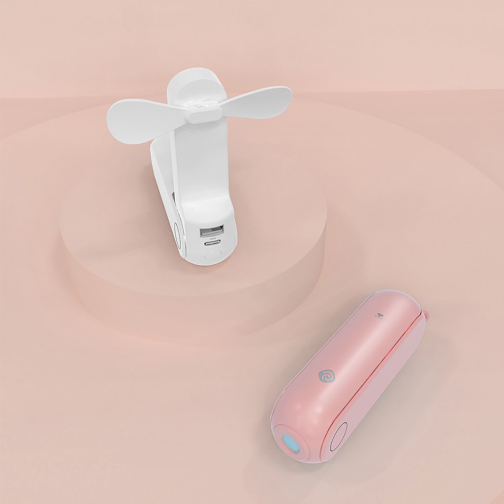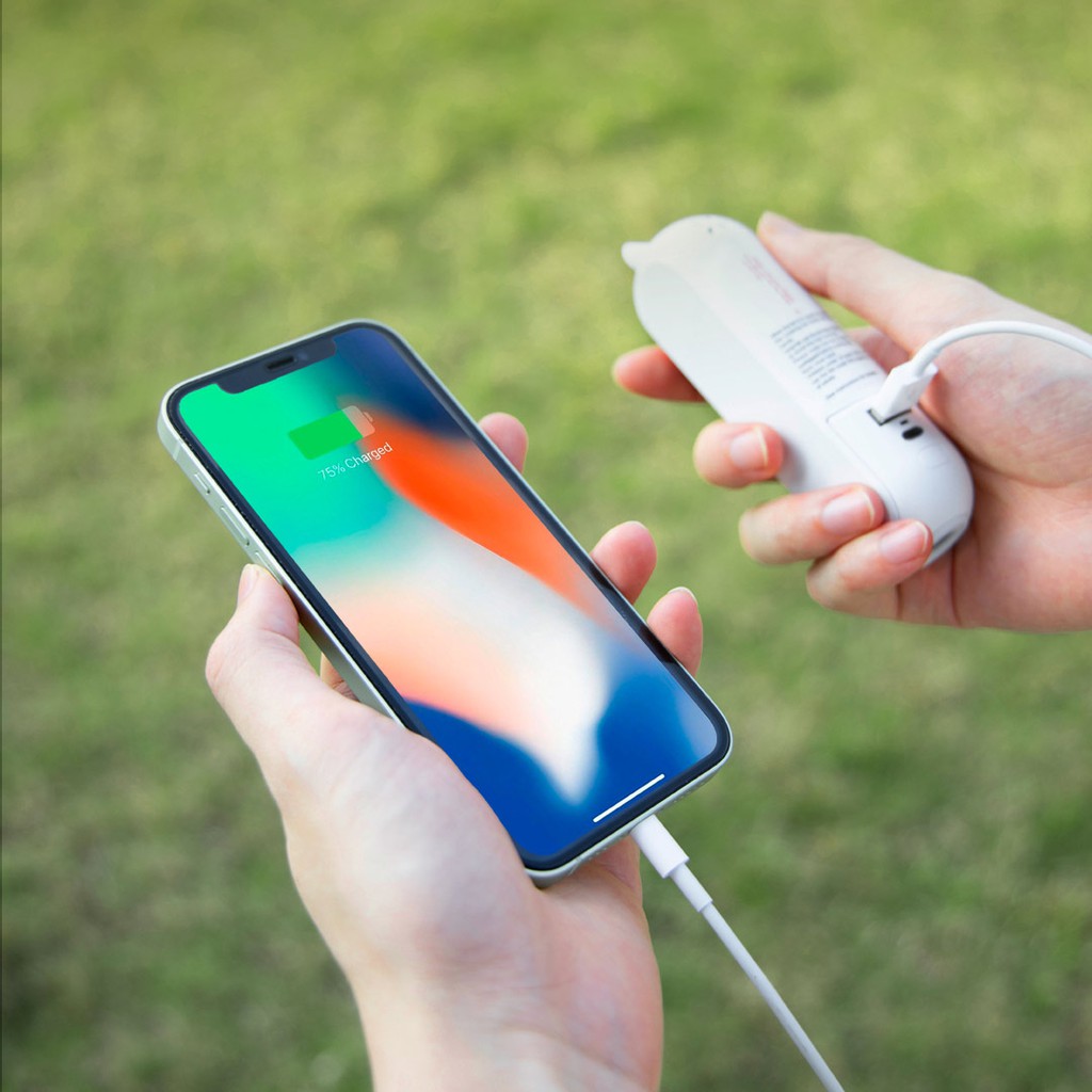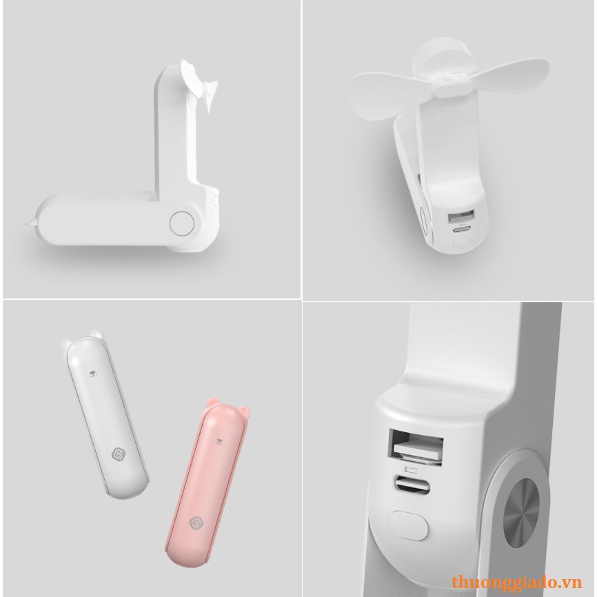 - Quạt được tích hợp viên pin dung lượng 2000mAh và hỗ trợ tính năng pin sạc dự phòng, cắm cáp sạc vào để sạc cho điện thoại khi cần dùng.