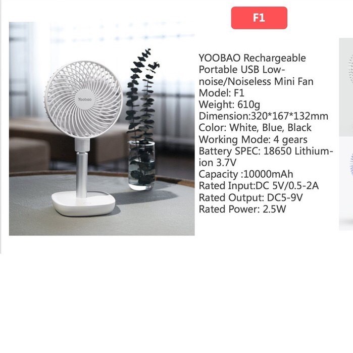 Giới thiệu [Mã ELHA22 giảm 5% đơn 300K] Quạt tích điện Yoobao F1 10000mah,pin sạc 60h liên tục.Hàng chính hãng
