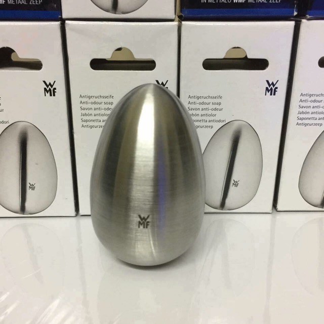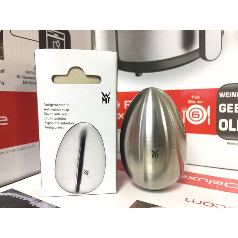 - Xà phòng kim loại dạng hình trứng giúp luôn đứng vững và tiện dụng khi để cạnh bồn rửa tay, vừa là vật trang trí đẹp mắt. Viên rửa tay khử mùi WMF Anti-Geruchseife Gourmet Made in Germany nhanh chóng làm sạch mùi trên tay sau khi chế biến cá, thịt, tỏi, hành…, khử sạch thực phẩm và mùi gia vị trên tay một cách nhanh chóng và lành tính. Theo kinh nghiệm người dùng quả trứng kiêm loại khử mùi WMF này dùng được rất rất lâu. Có lẽ công thức chế tạo ra nó vẫn còn là một bị mật của hãng sản xuất nội thất nhà bếp WMF.