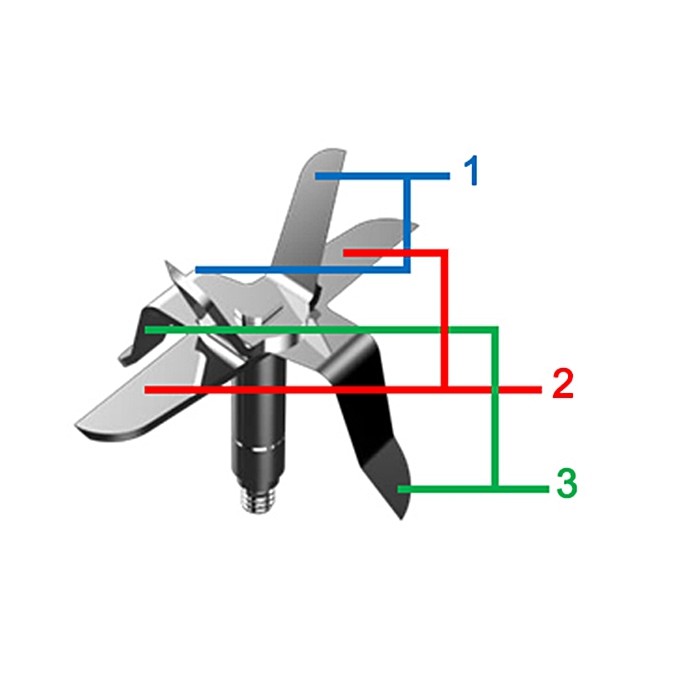 Máy xay sinh tố trang bị lưỡi dao với 3 chức năng: lưỡi răng cưa nghiền thực phẩm cứng và thực phẩm có nhiều xơ, lưỡi sắc băm nhuyễn và trộn thực phẩm với tốc độ cao, lưỡi cùn khuấy trộn thực phẩm và duy trì dòng xoáy.