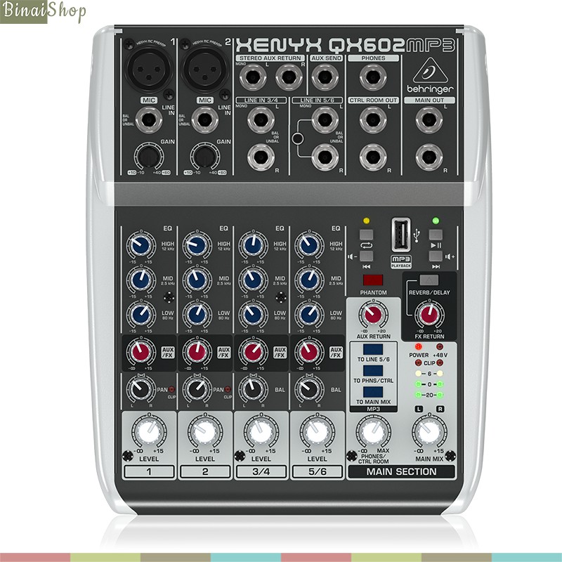 Mixer Behringer QX602MP3 là bàn trộn micro 6 cổng với khả năng cấp nguồn 48v cho 2 micro condenser, 2 cổng input analog 6.5 và kết nối input RCA, cho phép chạy nhạc và điều khiển bài hát mp3 từ USB, vô cùng linh hoạt trong sử dụng.