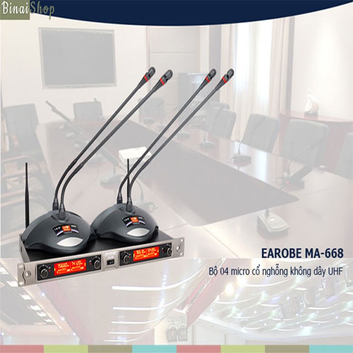 - Bộ 04 micro cổ ngỗng hội thảo EAROBE MA-668 sử dụng các dải tần sóng UHF riêng biệt trong khoảng 200-270MHz, cho cự ly truyền dẫn tín hiệu ổn định lên tới hơn 15m (không vật cản) và hoàn toàn không bị lẫn sóng.