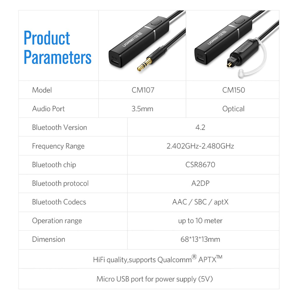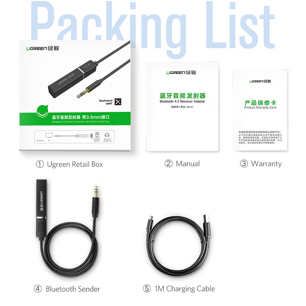 Ugreen 40761 là bộ chuyển đổi âm thanh thường thành âm thanh không dây cho các thiết bị nguồn phát có hỗ trợ cổng audio 3.5mm như điện thoại, laptop, PC, Tivi, TiviBox, PS4, Xbox One... đến đồng thời 2 tai nghe/loa Bluetooth cùng một lúc. Với thuật toán nén âm thanh kỹ thuật số aptX, Ugreen 40761 hạn chế tối đa việc thất thoát tín hiệu qua đường truyền Bluetooth, mang đến trải nghiệm âm thanh đạt chuẩn Hi-Fi sống động.THÔNG SỐ KỸ THUẬT :
