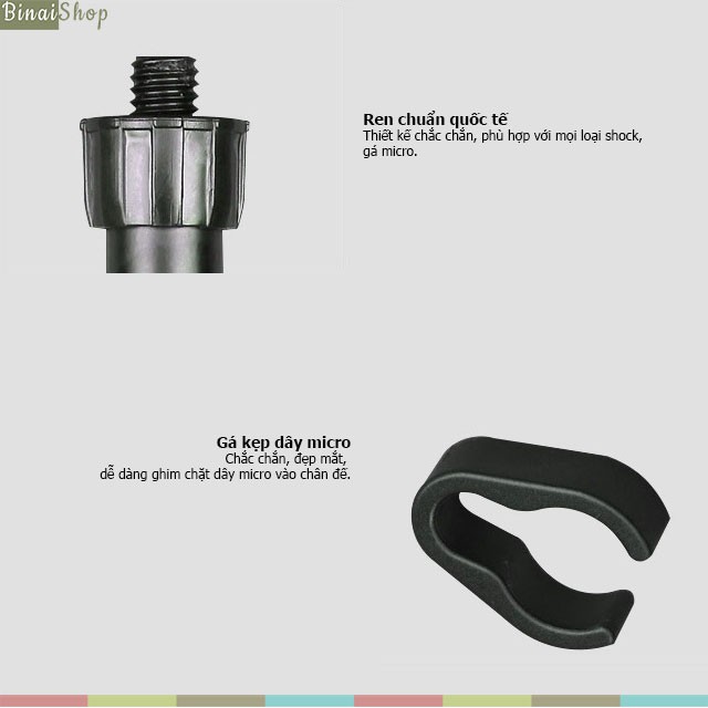 - Các khớp ren chuẩn quốc tế cho phép kết nối linh hoạt với nhiều loại shockmount, đầu gá mic.