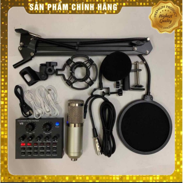 Combo mic thu âm bm-900 sound card V8 - 5 món bao gồm 5 món: Micro thu âm Ami BM900, sound card hát karaoke V8, màng lọc, giá đỡ micro, dây để livestream (trọn bộ không cần thêm bắt kỳ thiết bị nào khác)Bộ sản phẩm đầy đủ cho bạn thỏa sức thu âm những bài hát yêu thích.