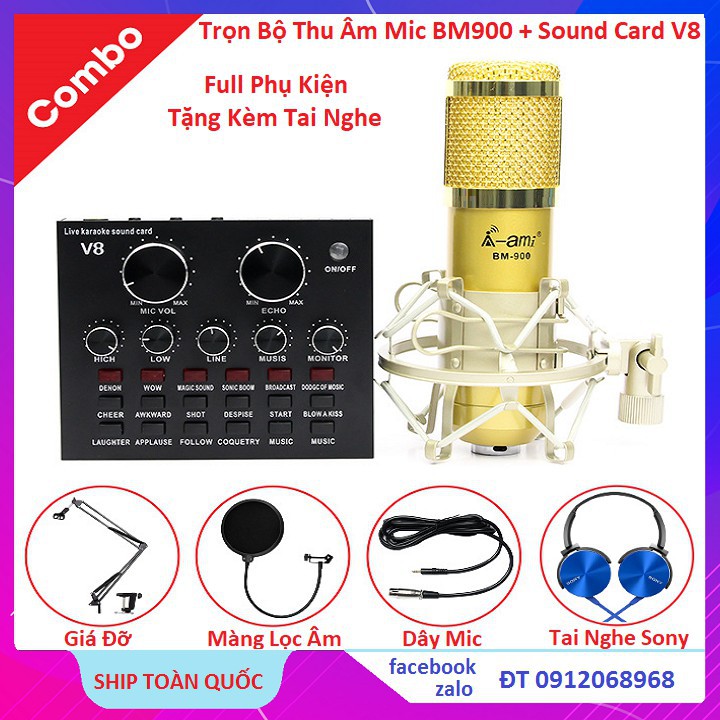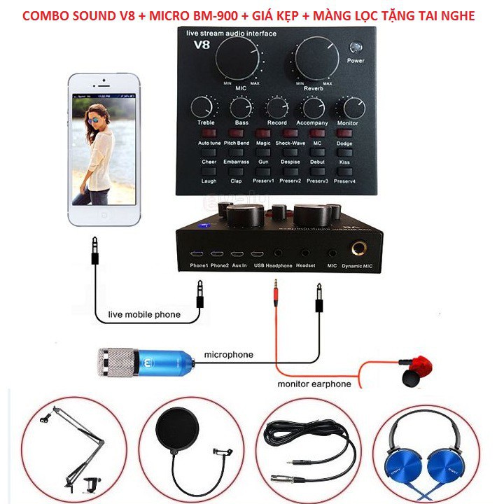 [Mã ELHACE giảm 4% đơn 300K] ComBo Đủ Bộ Soundcar V8 - Mic BM 900 - Giá Kẹp - Màng lọc - Tặng Tai Nghe Kiểm Âm 2020