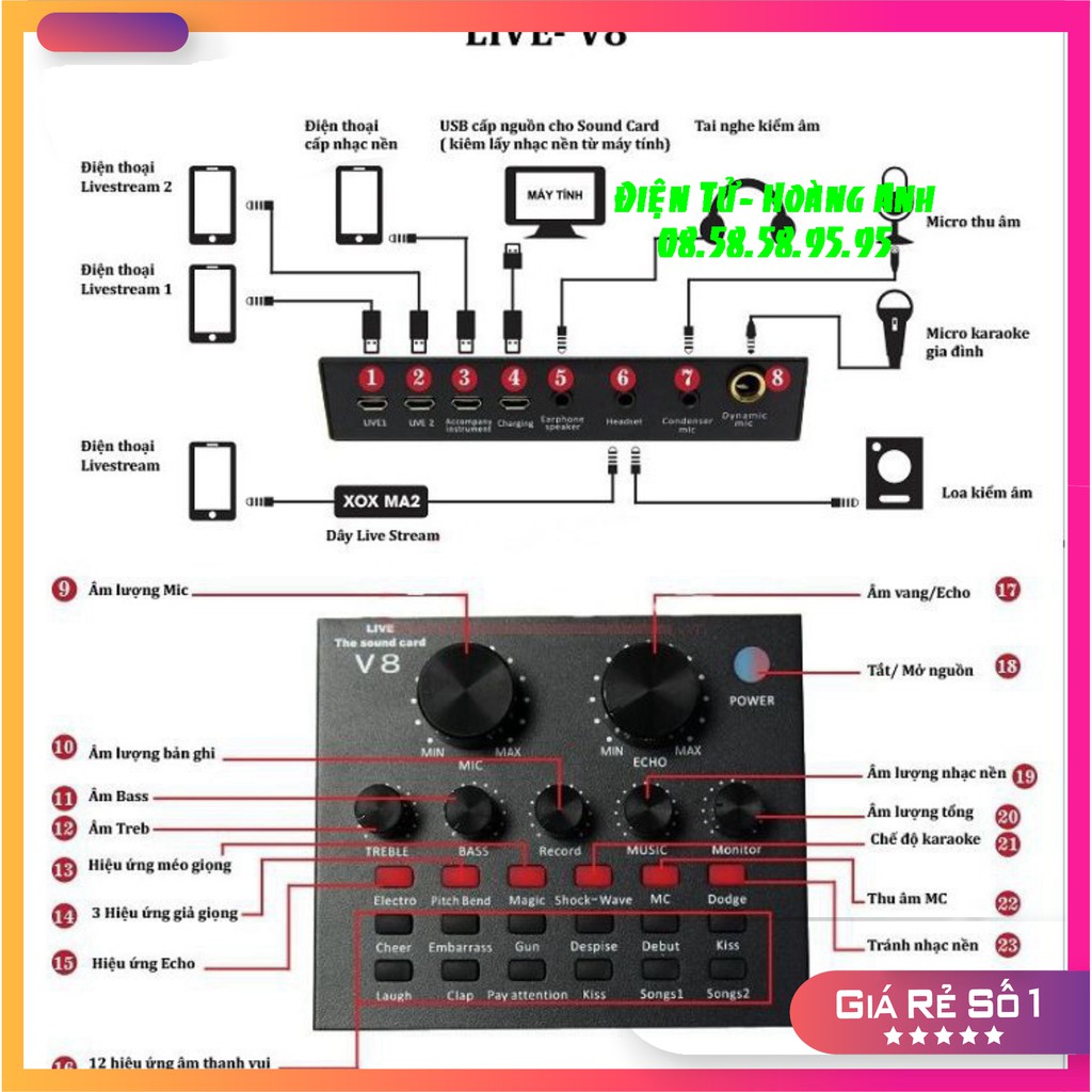 Sound card hiểu nôm na là “Card” Âm Thanh tức là thiết bị dùng để thu nhận, xử lý và phát tín hiệu âm thanh thông qua 1 thiết bị ngoại vi khác. Âm thanh trong máy tính là ở dạng digital (kỹ thuật số) muốn truyền tốt được ra ngoài cần có một thiết bị chuyển digital qua analog (tín hiệu băng tần) vậy nên Sound card thu âm V8 giúp máy bạn thực hiện điều đó.Sound card thu âm V8 là sản phẩm card âm thanh tương thích với nhiều thiết bị như smartphone, laptop, pc, máy tính bảng. Với tính năng làm méo giọng hát, thành giọng trẻ em, người già, Khả năng chèn các hiệu ứng âm thanh vào các đoạn thu như tiếng vỗ tay, tiếng hò reo, nhạc cổ vũ, tiếng chim kêu... với 12 hiệu ứng âm thanh, sẽ đem lại cho bạn trải nghiệm thu âm vô cùng thú vị.