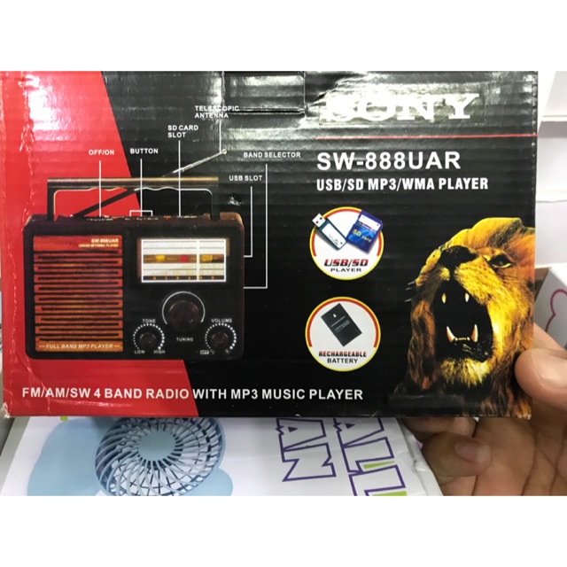 Đài radio FM hãng sony SW-888uar hoặc bản sw-8888uar bluetooth.- Đài Sony Sw-888UAR kiểu dáng nhỏ gọn, cung cấp cho người nghe những thông tin bổ ích nhất từ sóng radio.