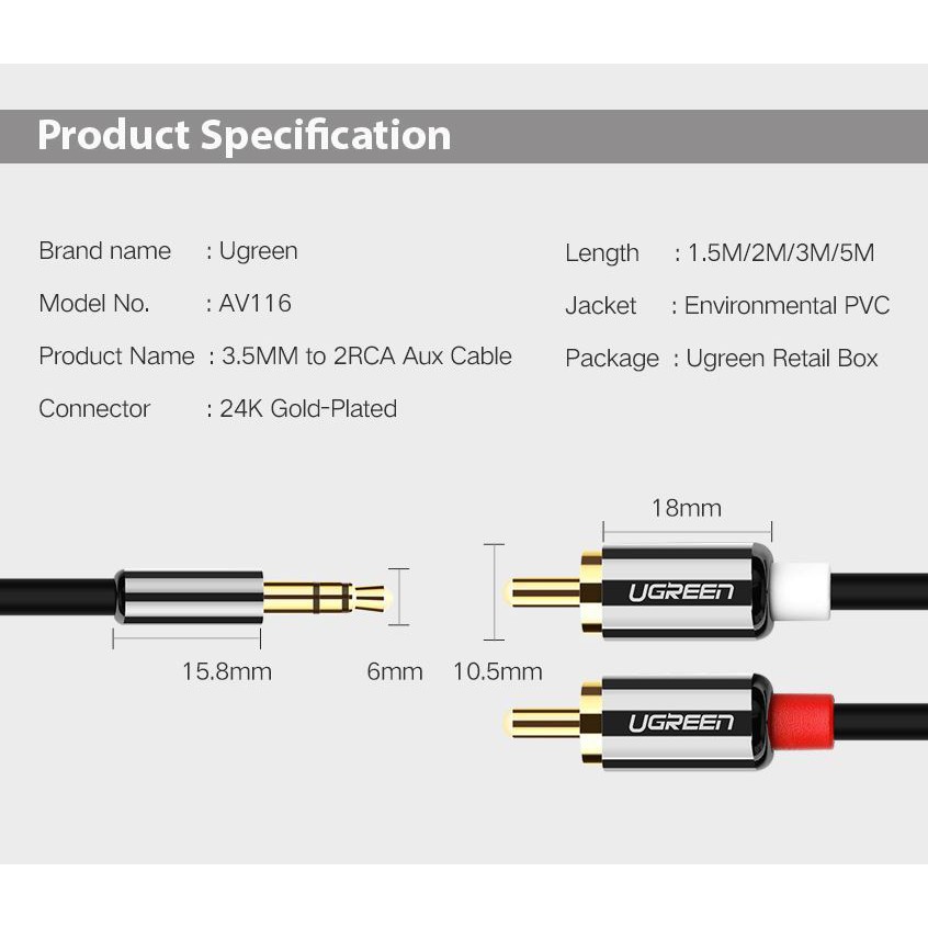 Giới Thiệu Sản Phẩm Ugreen AV116Cáp Audio 3,5mm Ra 2 Đầu RCA Ugreen AV116 được sử dụng để kết nối các thiết bị có cổng audio 3.5mm (AUX) như điện thoại, laptop, máy tính bảng, tivi box, ra loa hoặc dàn âm thanh kĩ thuật số cổng RCA (hay còn gọi là jack bông sen). Dây cáp âm thanh được thiết kế Lõi đồng nguyên chất bọc lớp nhựa bảo vệ PVC cao cấp cùng hai đầu jack cắm mạ vàng 24k đúc hợp kim, giúp tín hiệu audio được truyền dẫn với tốc độ ổn định và bền bỉ theo thời gian.