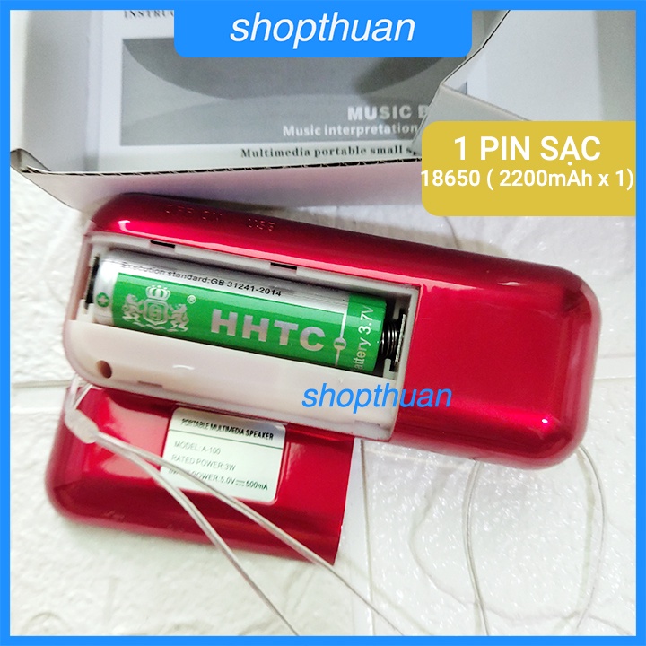 3 / Loa A-100 + Thẻ 16GB : 1 loa A-100 + 1 thẻ nhớ micro SD 16Gb ( thẻ tray - màu đen - class 4/6 ) + 1 pin 18650 ( màu xanh ) + 1 dây cáp sạc ( hình thang )