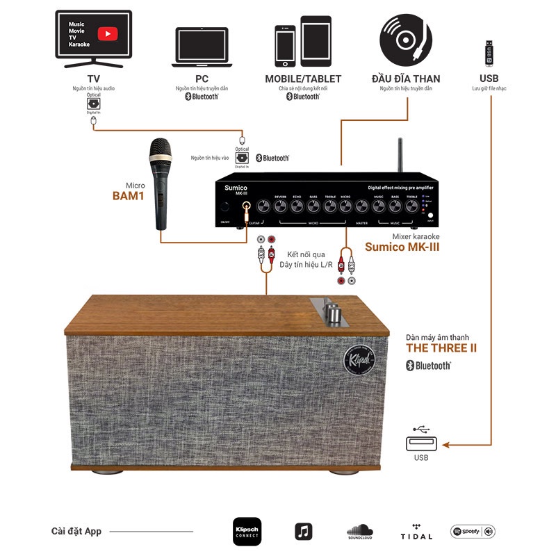 - Cổng vào: Bluetooth® 4.0 / 1 x AUX jack 3.5mm / 1 x RCA ( CD và Phono MM) / USB Type B
