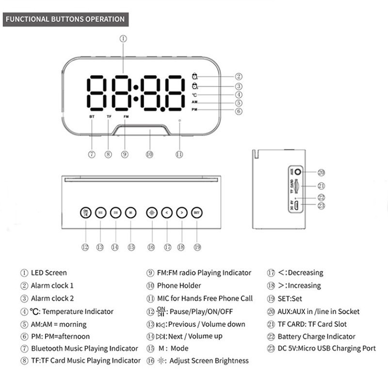 4. Loa bluetooth có Màn hình LED hiển thị lớn: LED hiển thị đồng hồ , báo thức, trạng thái chế độ, và nhiệt độ theo độ C . Bạn cũng có thể sử dụng nó như một chiếc gương soi. Và có thể điều chỉnh độ sáng 3 mức độ (BRIGHTEST, MIDDLE & LOWEST).