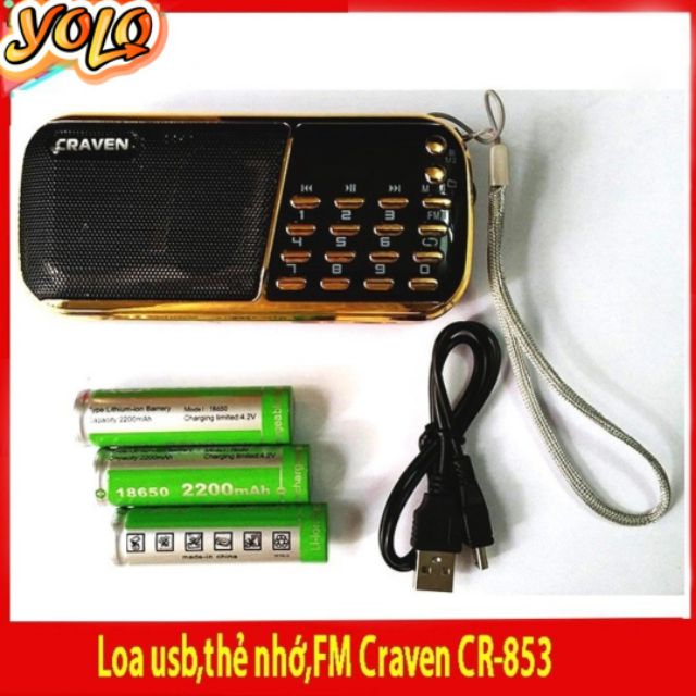 ~~ Loa nghe nhạc USB thẻ nhớ FM Craven CR-853 3 pin siêu trâu, âm thanh 2.0 mạnh mẽ, loa sử dụng pin rời với dung lượng lớn, nghe radio + nhạc từ thẻ TF/USB. Kiểu dáng phụ kiện nghe nhạc hiện đại và ấn tượng ~~+ THÔNG TIN CHUNG: LOA CRAVEN CR-853