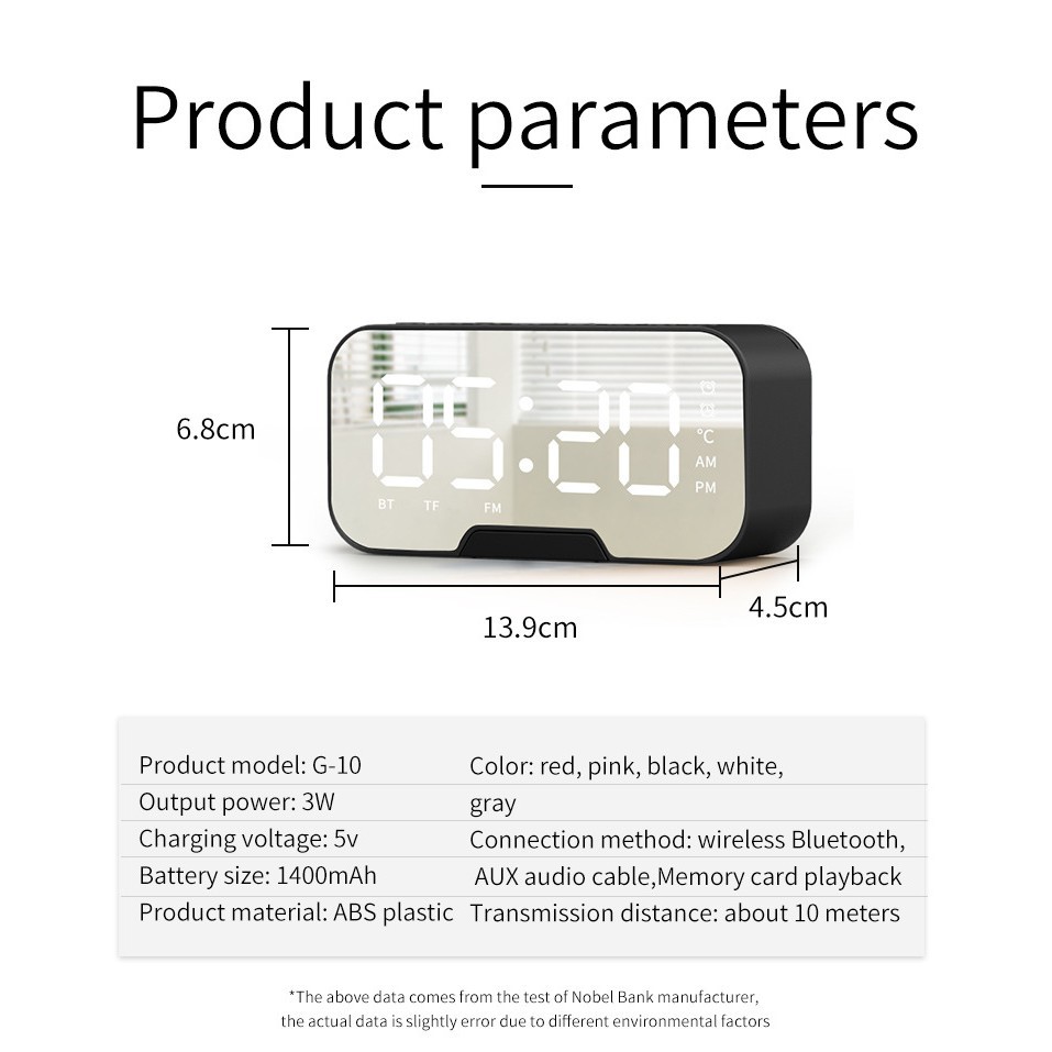 Tên sản phẩm: Loa Bluetooth kiêm đồng hồ G10 màn hình gương hiển thị đèn LED - Đài FM - Đồng Hồ Báo Thức*Lưu ý: Các bạn FOLLOW nhận ưu đãi voucher giảm 5k cho đơn hàng từ 99k nhé (số lượng có hạn)