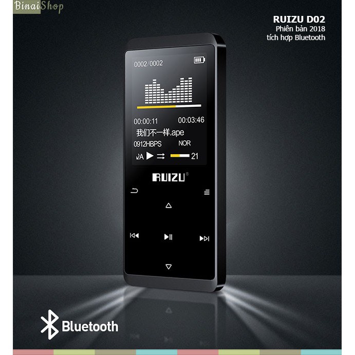 - Máy nghe nhạc mp3 Ruizu D02 được trang bị Bluetooth 4.0 với chip DAC chuyển tải âm thanh FLAC không bị suy hao tín hiệu, không làm giảm chất lượng nhạc.