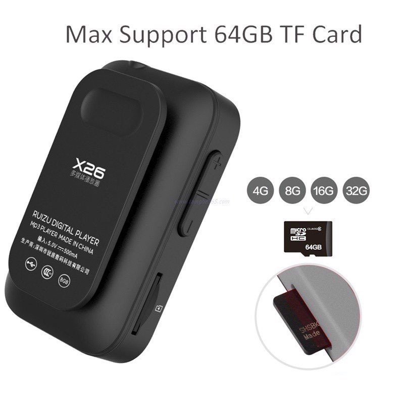 Máy nghe nhạc Ruizu X26 (8GB-Bluetooth) có kẹp áo tương tự như bản chuyên thể thao X55 tước đây nhưng có phần rút gọn về một số tính năng phụ hơn.