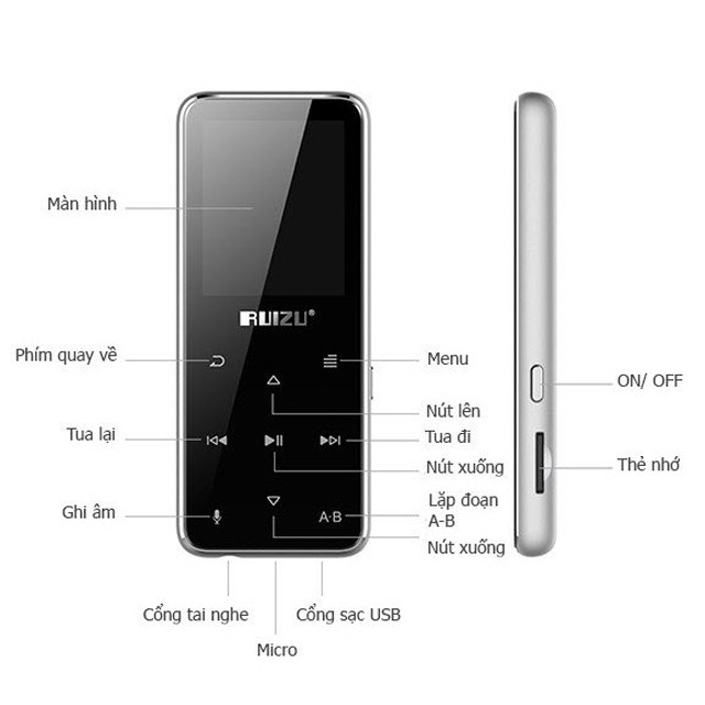 - Hỗ trợ Radio FM, Ghi âm, đọc sách txt, lặp đoạn A-B, đếm bước chạy