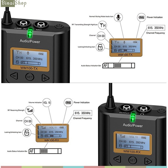 - Sóng UHF với 48 kênh có dải tần riêng, cho khả năng ghi âm với cự ly lên tới 100m và tránh lẫn sóng khi có nhiều bộ thu phát cùng sử dụng trong 1 khu vực.
