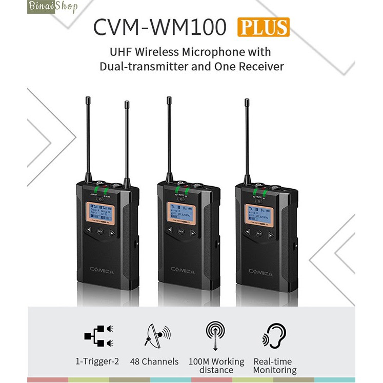 Micro không dây UHF cho máy ảnh Comica CVM-WM100 PlusComica CVM-WM100 Plus là phiên bản nâng cấp của CVM-WM100, với 2 bộ transmitter, chuyên dùng cho các buổi phỏng vấn, thu hình chuyên nghiệp. Được trang bị thêm phương thức cấp nguồn bằng củ sạc dự phòng điện thoại, cho khả năng sử dụng linh hoạt hơn.