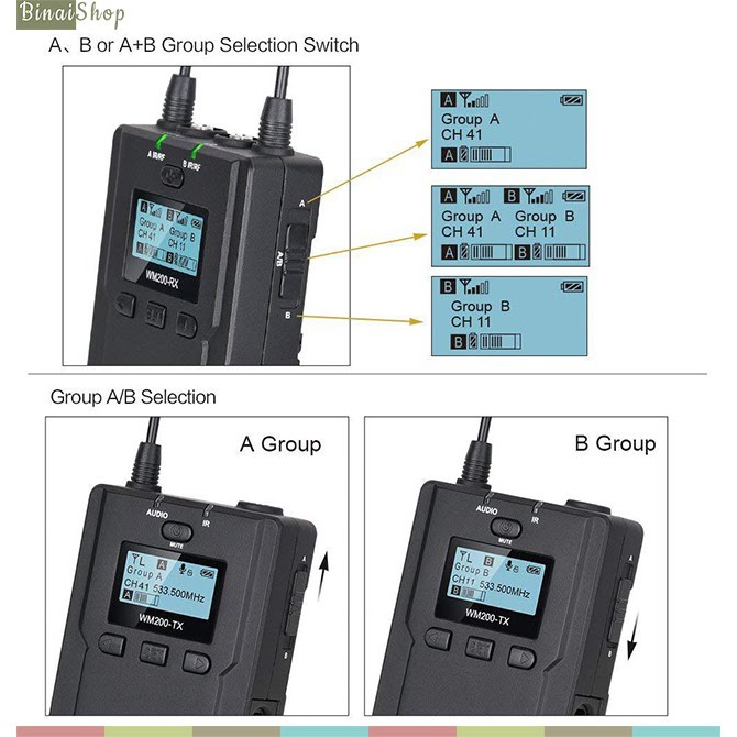 - Sử dụng sóng UHF với 96 băng tần nằm trong khoảng từ 520.000MHz-548.500MHz cho bộ phát nhóm A, 550.000MHz~578.500MHz cho bộ phát nhóm B, tuyệt đối không lẫn sóng với các thiết bị tương tự.