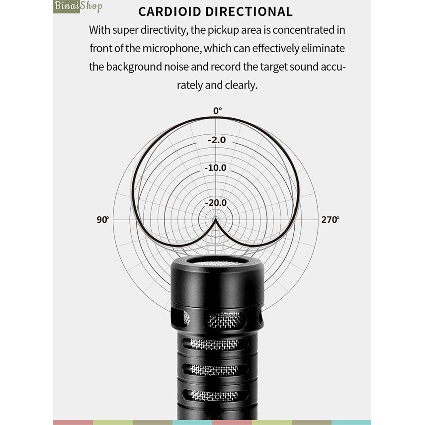 - Hướng thu super-directional, cho phép thu âm ở khoảng cách 3m trở lại.