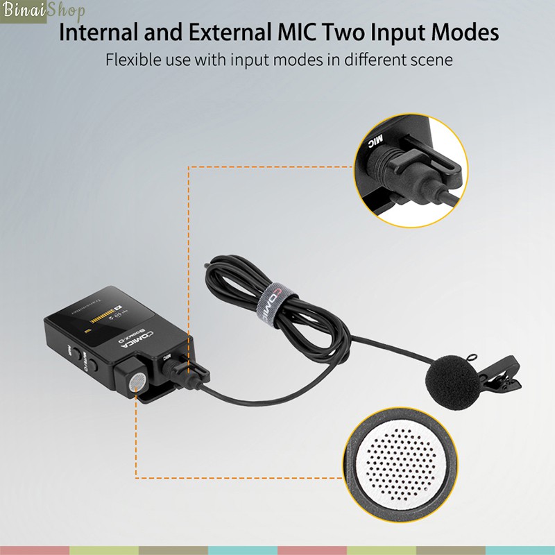Phạm vi làm việc lên tới 50m. Được thiết kế nhỏ gon với đai đeo đa chức năng, hỗ trợ nhiều thiết bị, tình huống ghi âm, ghi hình.