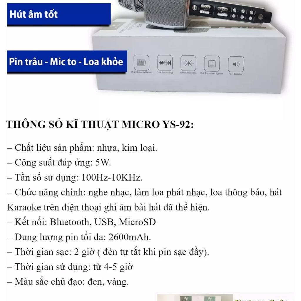 Giới thiệu [Mã ELHACE giảm 4% đơn 300K] Micro Karaoke Bluetooth YS-92 Không Dây Mic Livestream Kết Nối Không Dây Hỗ Trợ Ghi Âm