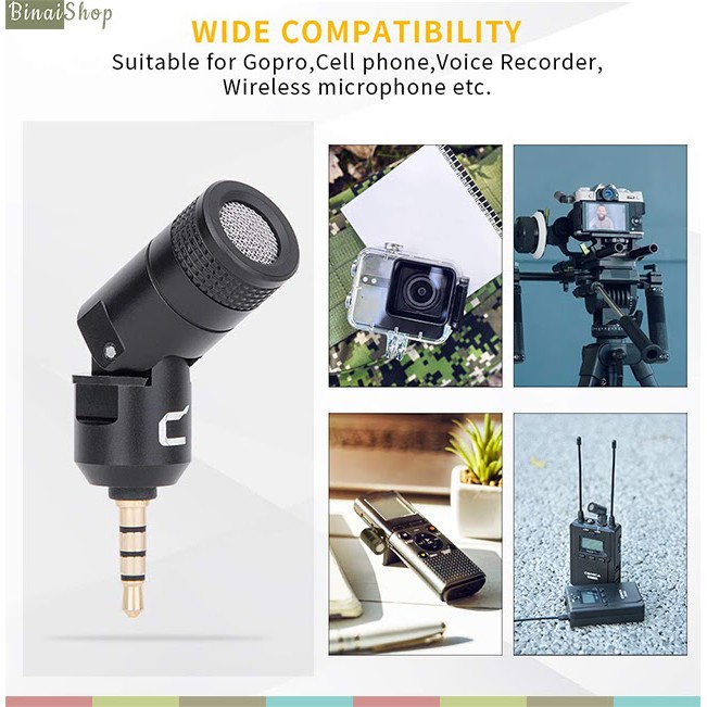 - Giắc cắm 3.5mm TRRS tương thích với phần lớn các dòng smartphone như Iphone, Samsung, LG, có thể sử dụng được cả với các dòng cam GoPro, DSLR.