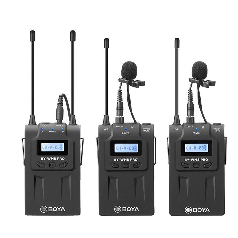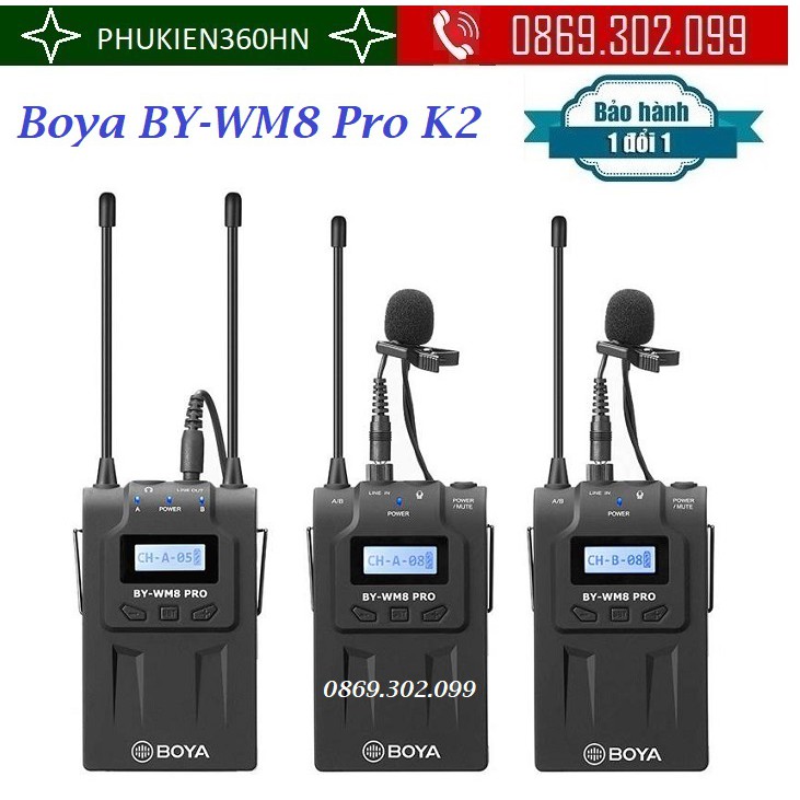 Micro không dây Boya BY-WM8 Pro-K2Boya BY-WM8 Pro-K2 là một hệ thống micro chuyên dụng kép không dây sử dụng tần sóng UHF vô cùng chuyên nghiệp và tiện lợi. Với thiết kế cho ENG, EFP,DSLR video, và dual-Channel có thể làm việc cùng lúc với cả hai máy phát.