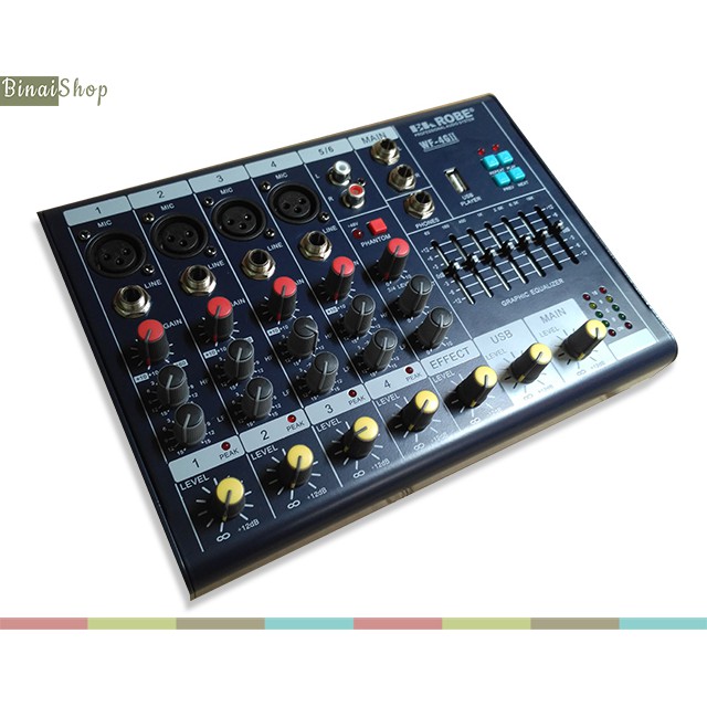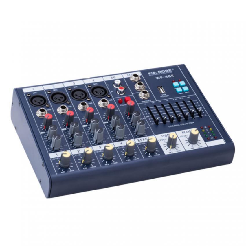 Giới thiệu sản phẩm Mixer mini EA ROBE WF-6G (Đen)Bộ trộn âm thanh chuyên nghiệp EA Robe Slim Mixer WF-6G cho phép tiếp nhận 6 kênh đầu vào với chất lượng âm thanh vợt chội. Sử dụng trực tiếp mic condenser với nguồn 48v qua cổng XLR cho chất lượng thu âm trung thực nhất.