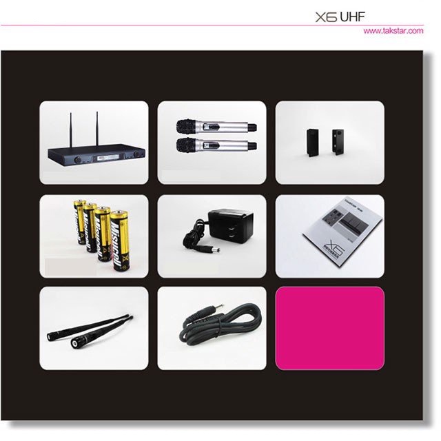 Micro không dây X6 sử dụng công nghệ sóng không dây UFH cho phép hoạt động tốt ở khoảng cách 50m và có khả năng kết nối được với nhiều micro cùng một lúc. Sử dụng 2 viên pin AA dễ dàng thay thế với màn hình hiển thị LCD trên cả micro và bộ thu kèm theo công nghệ dò sóng không nhiễu cao cấp tăng khả năng sử dụng linh hoạt. Micro Tastar X6 có thiết kế bằng kim loại bền bỉ. Sản phầm phù hợp cho phòng hát karaoke, phòng học và hội nghị.