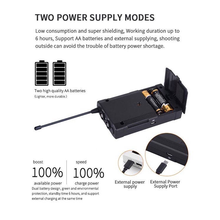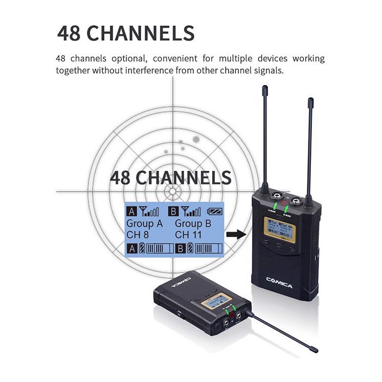- Sử dụng 2 bộ phát chỉ với 1 bộ thu sóng với 48 kênh sóng và tần số sóng riêng biệt, tránh nhiễu tín hiệu với các thiết bị sử dụng sóng UHF khác.