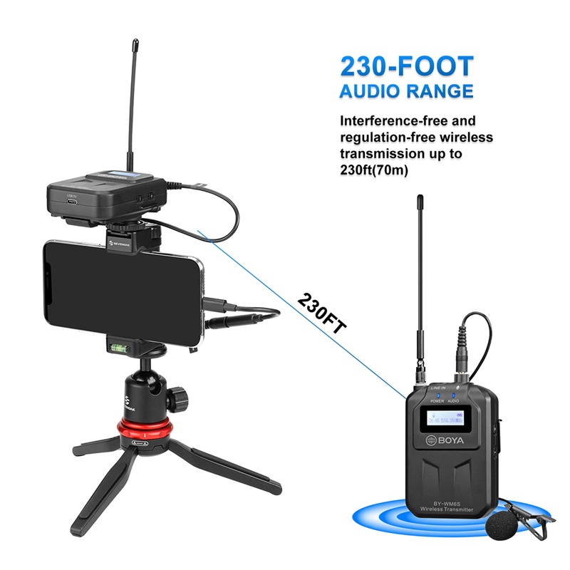 BOYA BY-WM6S là bộ micro không dây UHF thế hệ mới, tương thích với điện thoại thông minh, máy tính bảng, máy ảnh DSLR, máy quay phim, máy ghi âm... Với mức độ nhiễu thấp, kênh sóng UHF đa dạng và phạm vi hoạt động rộng, nó mang lại chất lượng âm thanh ổn định ngay cả trong điều kiện khó khăn.