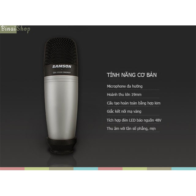 Micro condenser Samson C01 là dòng micro thu âm đa hướng (hypercardioid) với màng thu 19mm hai lớp thiết kế siêu mỏng cảm biến âm thanh chi tiết cho chất lượng âm thanh trung thực, chi tiết, trầm ấm và mịn.