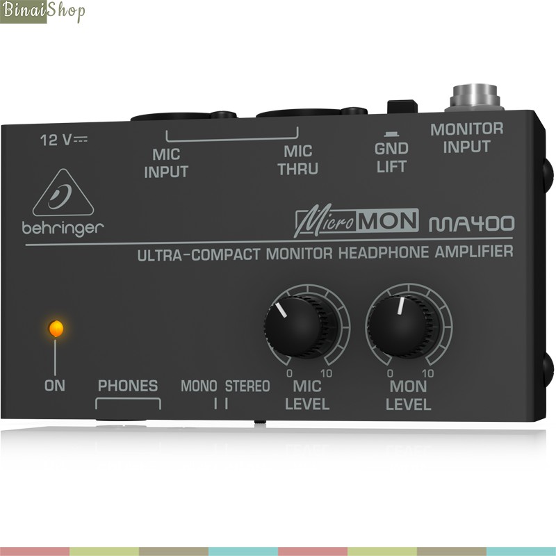 Bộ khuếch đại tai nghe Behringer Micromon MA400 được thiết kế với kích thước nhỏ gọn, nó không chỉ nhận âm thanh đầu vào từ mixer mà còn có thể nhận tín hiệu từ micro thông qua một cổng XLR mở rộng. MA400 thậm chí có thể sử dụng cho micro condenser 48V bởi khả năng cấp nguồn phantom cho micro. MA400 còn là một mixer cá nhân với khả năng kết hợp âm thanh từ micro và tín hiệu monitor đầu vào.