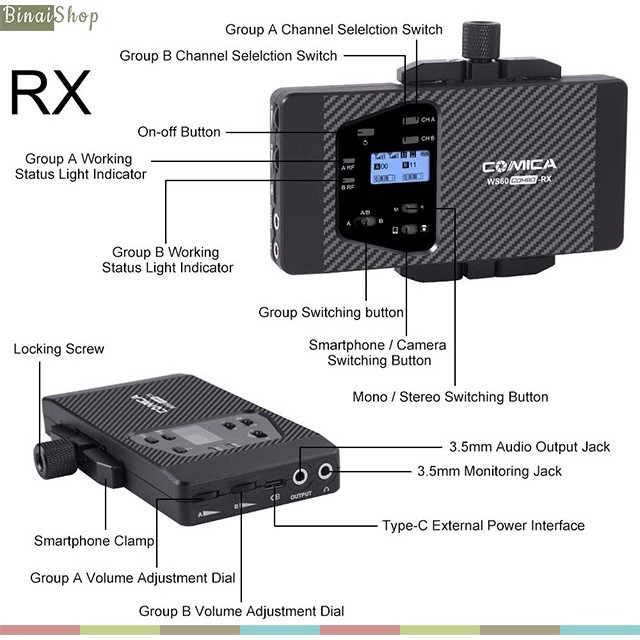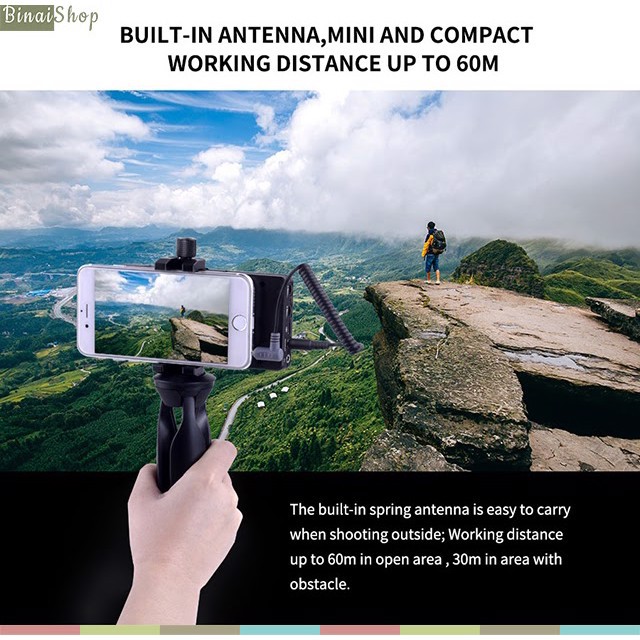 - Thiết kế đặc biệt dành cho Camera, máy ảnh và smartphone: Nút lựa chọn phương pháp hoạt động cho Camera/Máy ảnh DSLR hoặc Smartphone bên hông receiver.