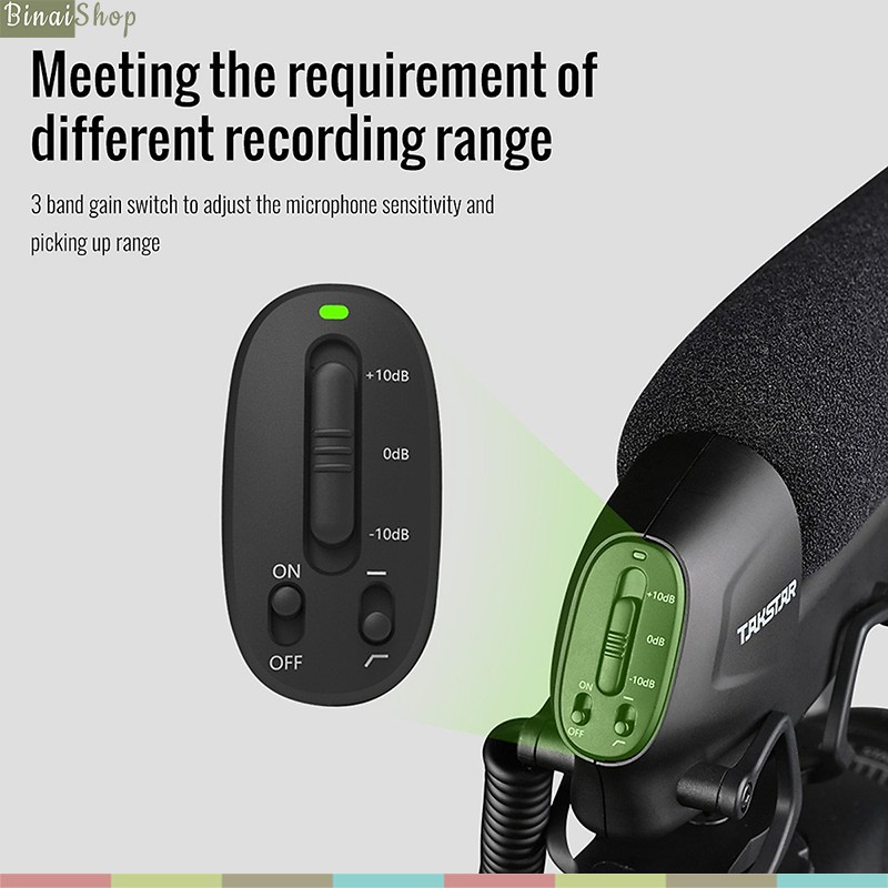 3 nấc chỉnh âm lượng, có thể điều khiển độ nhạy microtùy vào khoảng cách đón âm khác nhau, dễ dàng thu được âm thanh xa và gần.