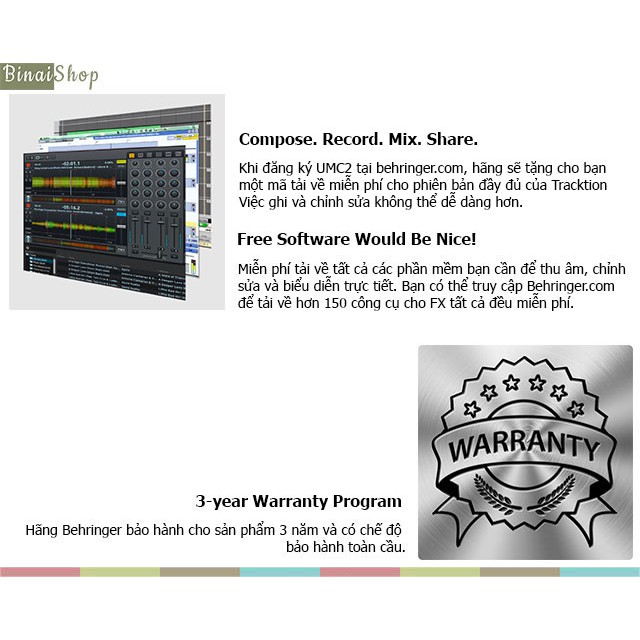- Tặng phần mềm thu âm, chỉnh sửa và biểu diễn trực tiếp miễn phí. Mở rộng thêm 150 công cụ / hiệu ứng plug-ins tại behringer.com