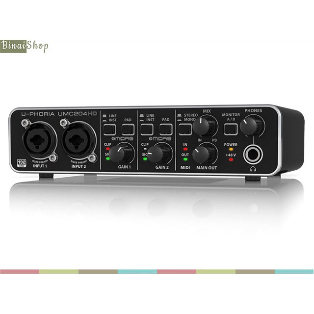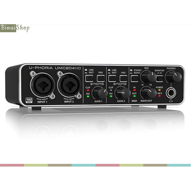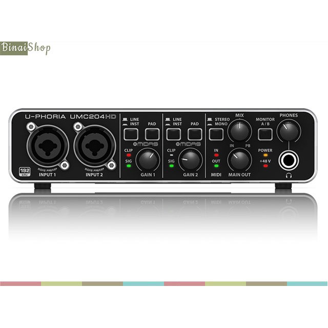- Sound card phòng thu Behringer U-PHORIA UMC204HD với giao diện Audio / MIDI USB 2.0 với 2 in x 4 out để thu âm micro và nhạc cụ.