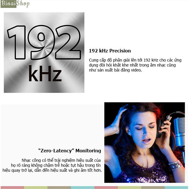 - Độ phân giải âm thanh 24-Bit / 192 kHz cho chất lượng âm thanh chuyên nghiệp.