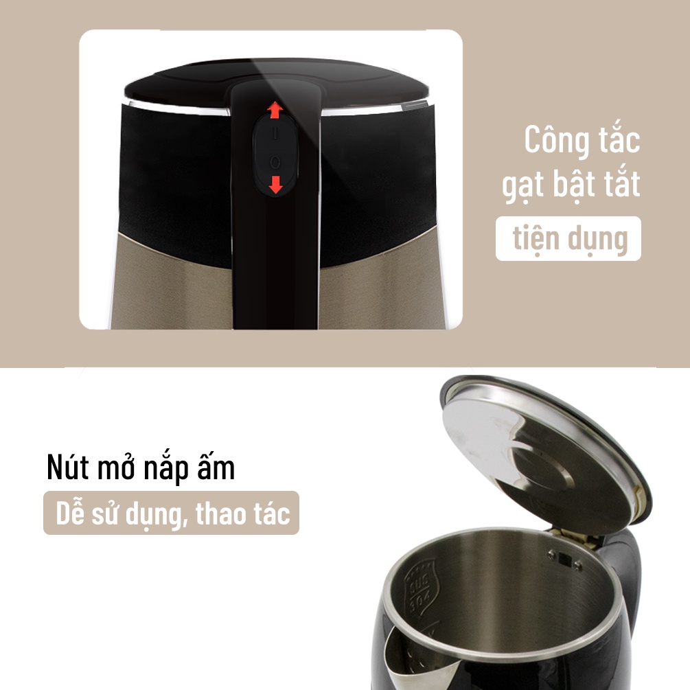 - Thiết kế thân bình 2 lớp, gồm lớp ngoài là nhựa cao cấp chịu nhiệt tốt, độ sáng bóng đẹp và sang trọng, bên trong là inox 304 liền khối, không có mối nối như nhưng ấm siêu tốc thông thường.