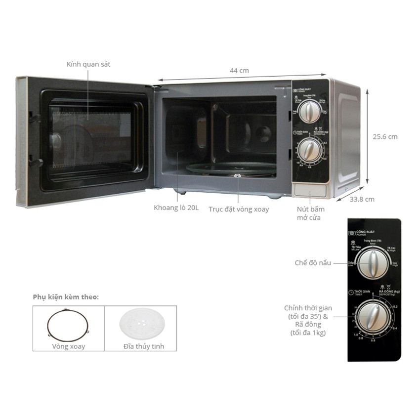 Loại lò: Vi sóng cơ Công suất: 800W Dung tích: 20 lít Chức năng: Nấu, hâm, rã đông