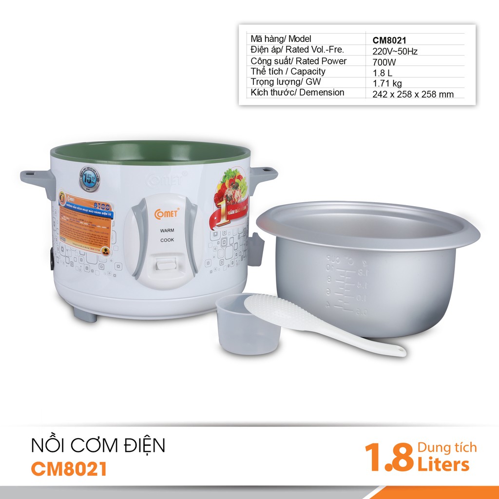 Thiết Bị Điện Gia Dụng > Đồ gia dụng nhà bếp > Nồi cơm điện || [Mã ELHADEV giảm 4% đơn 300K] Nồi cơm điện nắp rời 1.8L Comet CM8021Còn hàng