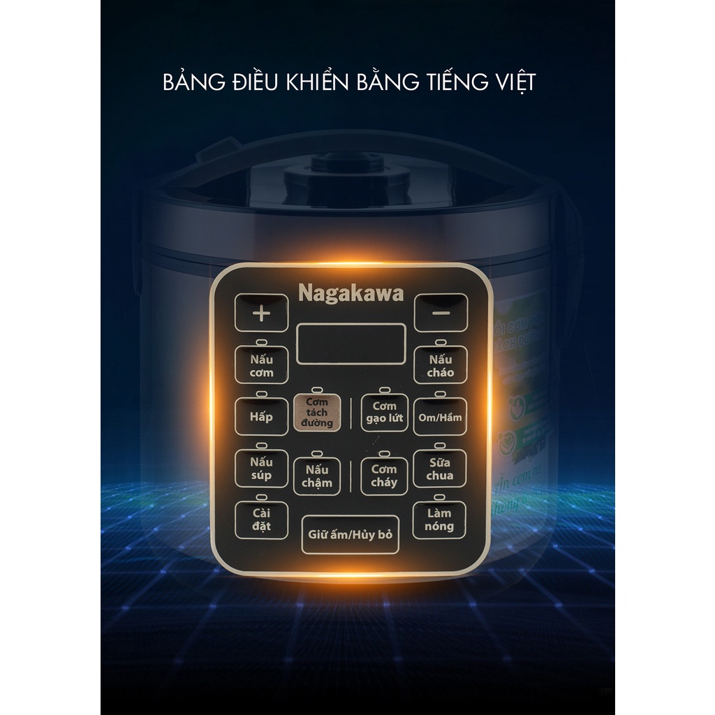 Nồi cơm điện tử Nagakawa NAG0120 sử dụng bảng điều khiển điện tử với ngôn ngữ tiếng việt cùng 10 chương trình nấu tiện dụng giúp cho việc nấu nướng trở nên đơn giản hơn.