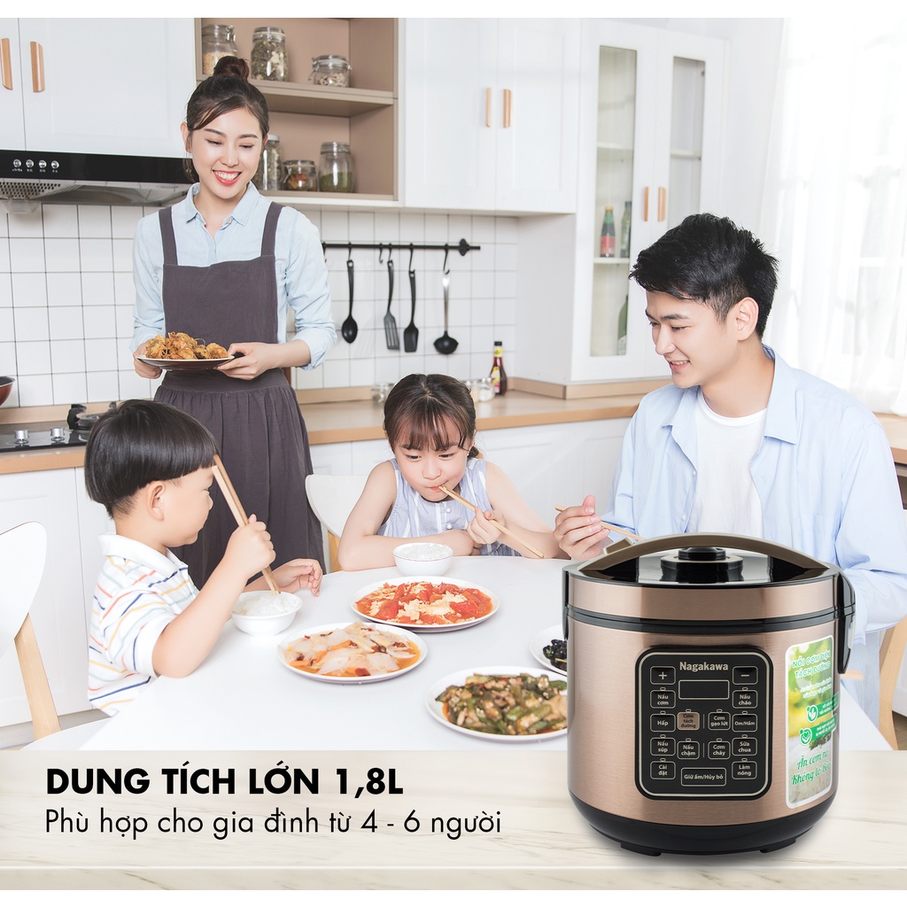Nồi cơm điện tử Nagakawa NAG0120 có dung tích 1,8 lít rất tiện dụng thích hợp sử dụng để nấu cơm cho gia đình có từ 4-6 thành viên