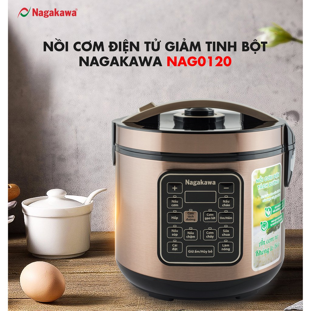 - Nồi cơm điện tử NAGAKAWA NAG0120Nồi thiết kế đặc biệt, giúp làm giảm lượng đường và tinh bột với cơ chế nấu thông thường lại đảm bảo cơm vẫn giữ được độ thơm dẻo vốn có, không có hiện tượng nhão nát như một số sản phẩm có mặt tại thị trường.
