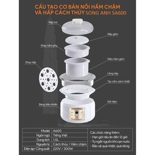 Nồi Nấu Cháo, Chưng Yến Nồi Hầm Chậm Và Hấp Cách Thủy Đa Năng Song Anh cách thuỷ phiên bản mới A600THÔNG SỐ KỸ THUẬT: