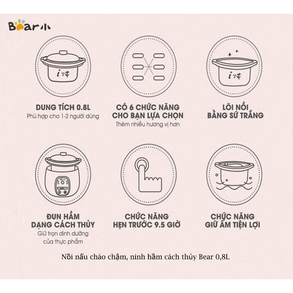 Để đáp ứng nhu cầu của người dùng là cần sản phẩm chất lượng, đảm bảo an toàn khi đun nấu, giữ nhiệt tốt, không biến tính thực phẩm thì hãng đồ gia dụng nổi tiếng Bear đã ra mắt nồi Ninh Hầm Cách Thuỷ, Nồi Nấu Cháo Chậm Bear với 2 loại: dung tích 0,8L và dung tích 1,6L.Nồi Bear hoạt động theo nguyên tắc cách thủy nên đảm bảo không làm mất chất dinh dưỡng của thực phẩm đun nấu, giữ nhiệt lâu hơn, và tránh được tình trạng sôi trào khi đun nấu có thể vừa nấu cháo vừa hấp củ quả được.