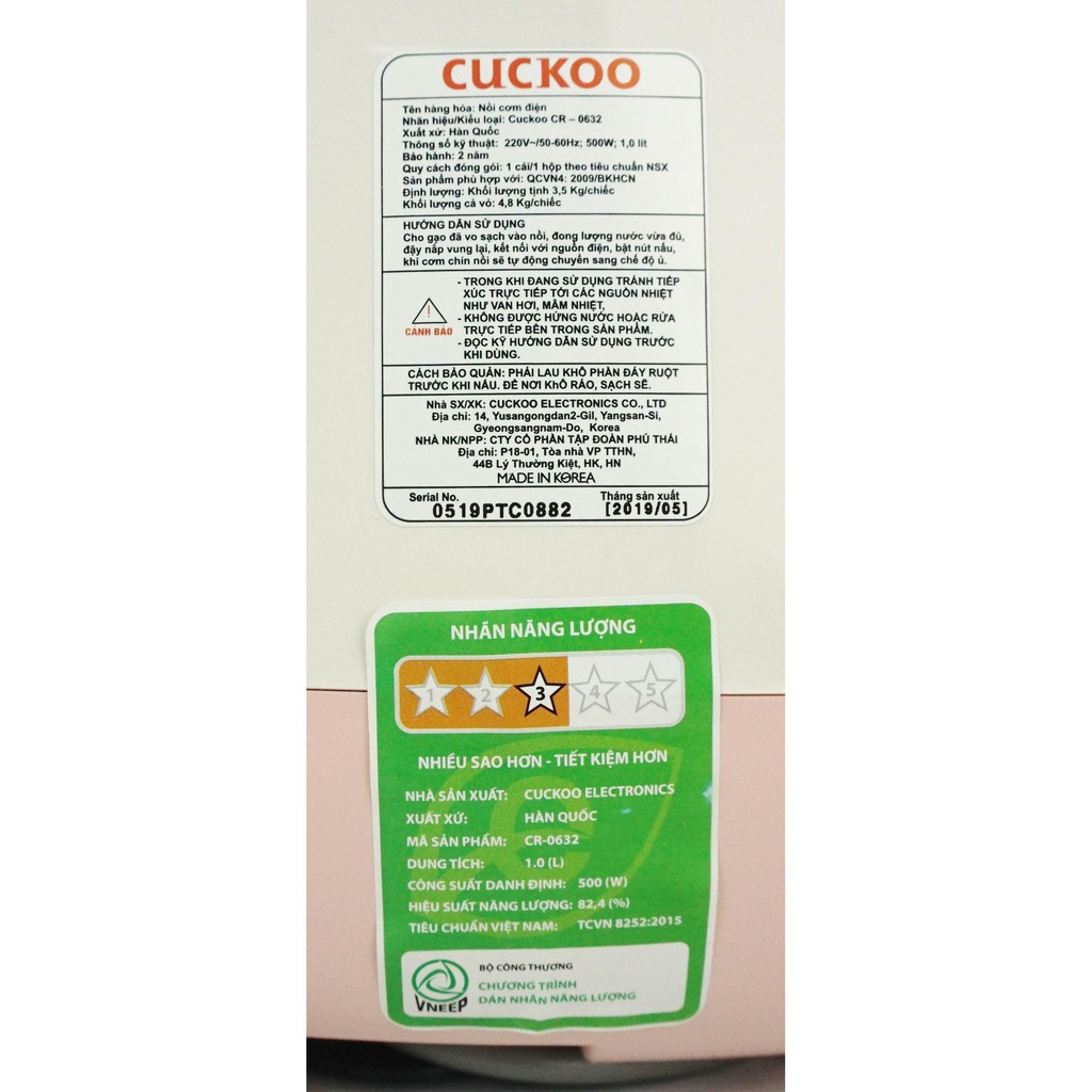 Thiết Bị Điện Gia Dụng > Đồ gia dụng nhà bếp > Nồi cơm điện || [Mã ELHADEV giảm 4% đơn 300K] Nồi cơm điện 1 lít Cuckoo CR-0632 chính hãng bảo hành toàn quốcCòn hàng