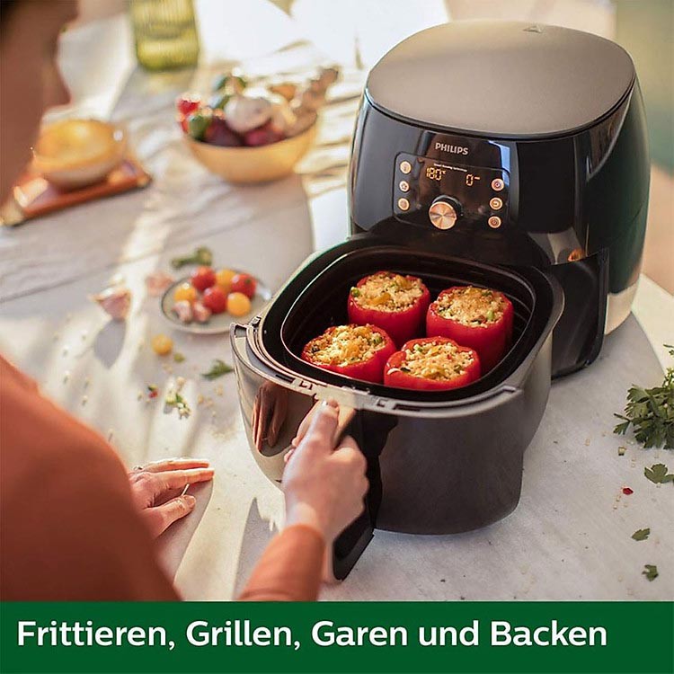 Thưởng thức đồ chiên rán tốt cho sức khỏe bên ngoài giòn và bên trong mềm hơn với chất béo ít hơn 90% *. Philips - - Airfasher XXL sử dụng không khí nóng (thay vì dầu) để chiên thức ăn với ít hoặc không thêm dầu. Philips Rapid Air tạo ra luồng không khí nhanh hơn 7 lần để bạn có thể thưởng thức kết quả rõ nét hơn và hương vị thơm ngon.